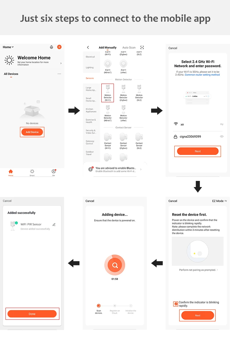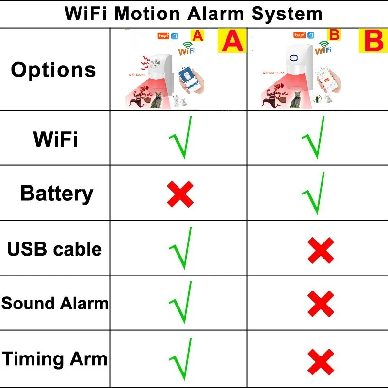 • WIFI MOTION SENSOR: Wireless motion sensor alarm, 110°detection angle, 6-40 feet detection distance, without any hub, realize real-time monitoring day and night. Uses 2*AAA batteries(Not included),six months battery life. (Only support 2.4G Wi-Fi, dual-band (2.4G and 5G) need to set a separate 2.4G channel)
