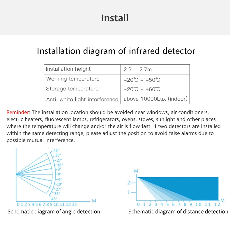 • Use 2pcs AAA batteries,Ultra-long Standby Time. working time can last for six months without to replace the battery. (NOTE: Please donot install the sensor in shopping malls, streets and other places where people come and go, it will affect the battery life)