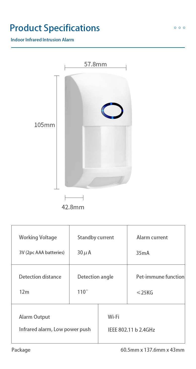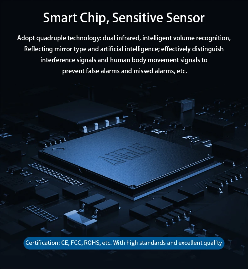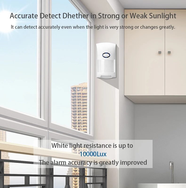 • the smart motion sensor with reflecting mirror detection technology,it can accurately alarm, realize real-time monitoring day or night;prevent false alarms or under report from pets under