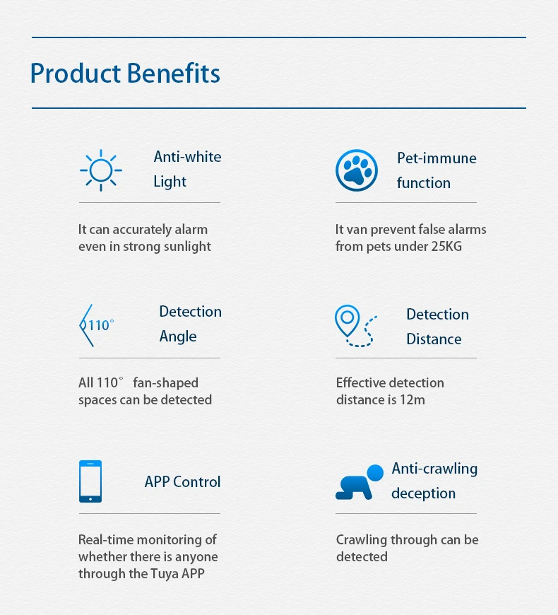 • MORE SECURE DESIGN: Wireless motion detector, Using dual-element infrared, effectively overcome the traditional shortcomings of detectors sneaking and crawling without warning. Intelligent volume recognition, it can refrain small pets from falsely reporting that pets weighing less than 25KG. Tuya motion sensor alarm can accurately alarm even in strong sunlight(Anti-white light 6500Lux).