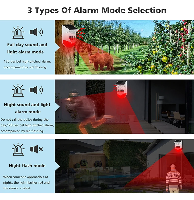 【Wide Application】The Solar Strobe Alarm Light is suitable for the safety of residential house,farm,villas, hotels, markets,boarding house and other places where requiring security alarm,can effectively drive away animals and identify pets, without false alarms.