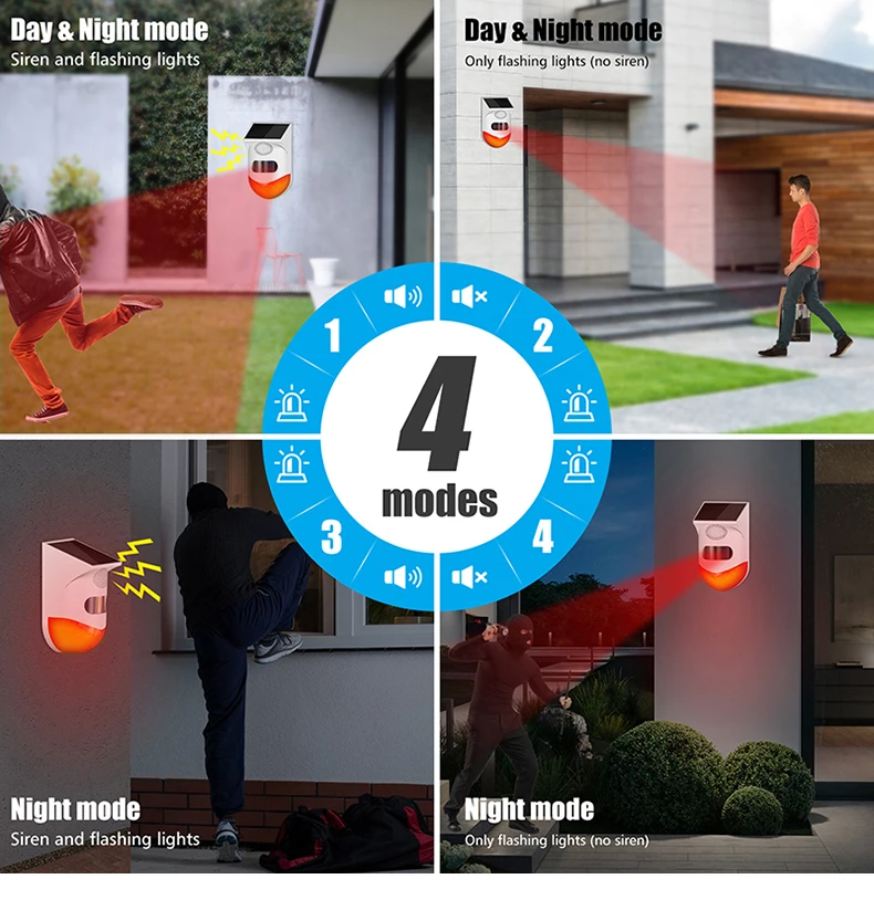 The solar motion sensor strobe siren light has an IP67 waterproof rating and a sturdy ABS shell, which allows your security strobe light to maintain the best performance outdoors throughout the year, and is suitable for all climates.