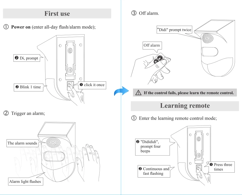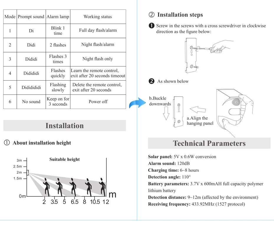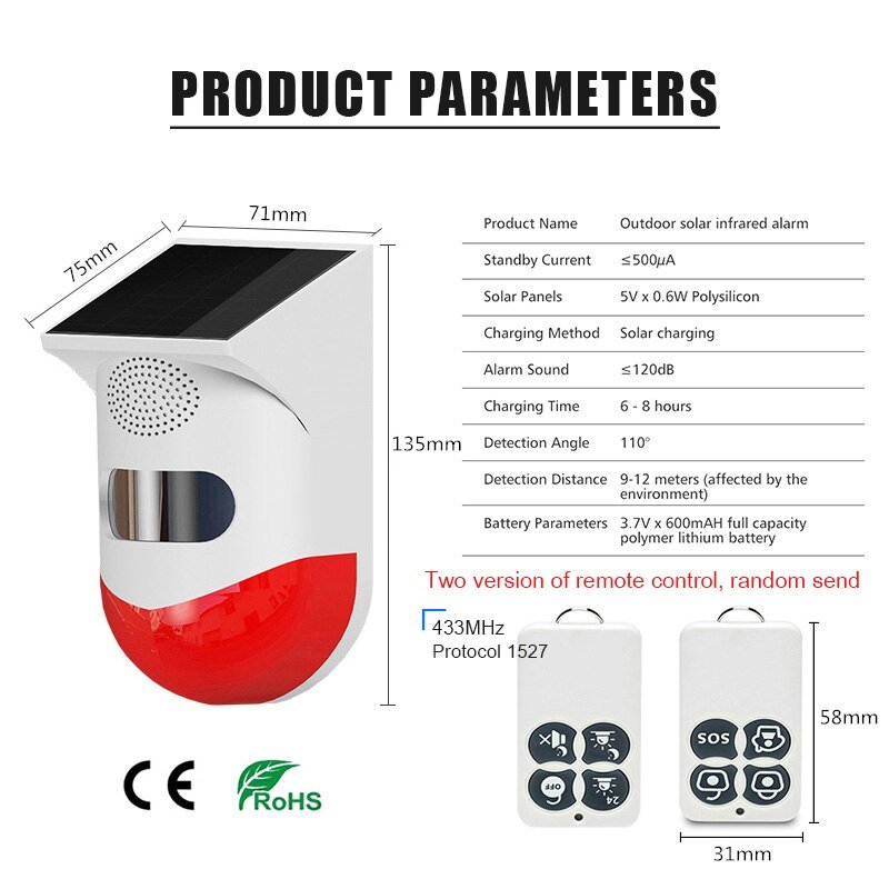 【Loud Siren & Sensitive Motion Sensor】The solar alarm motion detector has a sensing angle of 110°, it will detect any movement within a range of 9-12 meters(Affected by the environment).The siren sound is 120db which can protect the places you need security alarm from intrusion.