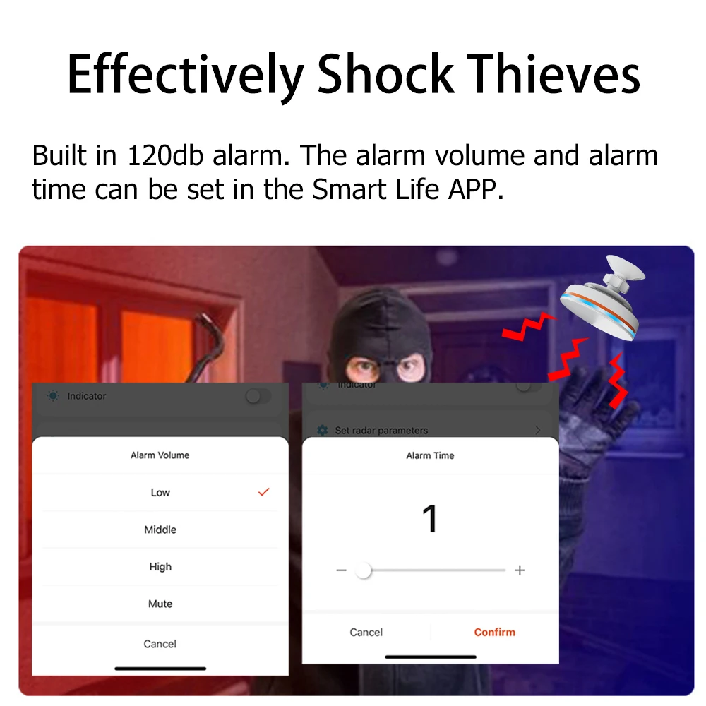 There are three modes available on the APP homepage: Armed/Disarmed/Alarming. You can also set the alarm duration and volume in the APP. In Armed mode, the sensor detects the presence of a person and emits an alarm sound. If you don’t want to hear the alarm sound, you can switch to Disarmed mode