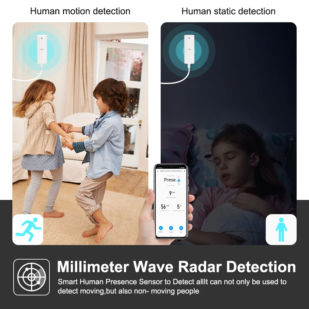 It detect micro/macro motions enables you to detect human presence within a configured distance, and get alerts in real time via app.