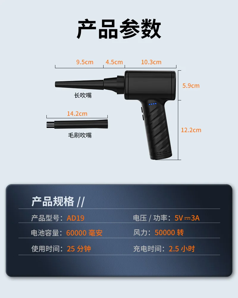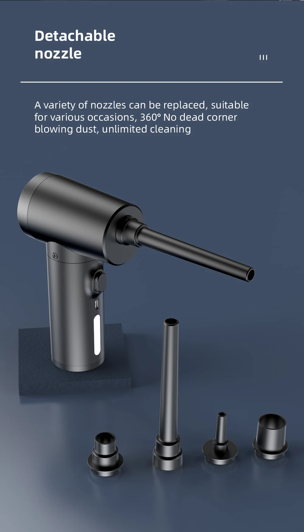 Super strong wind, long endurance, compact design, convenient to carry, detachable nozzle, small helper for dust removal.