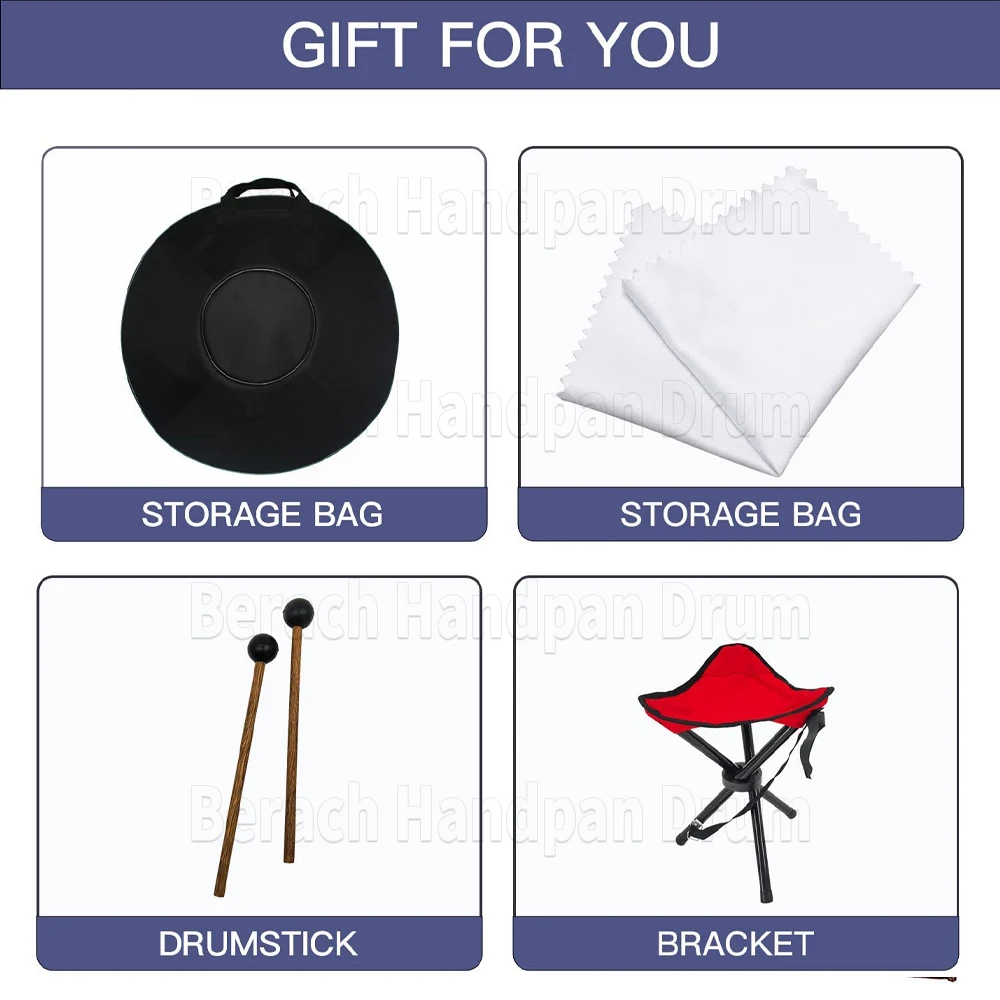 【Packing List】♬: 1 handpan drum, 1 drum bag, 2 drumsticks, 1 drum holder and 1 dust cloth. In the carrying case you can easily carry without breaking the drums. A complimentary cloth can help you clean your tambourine.
