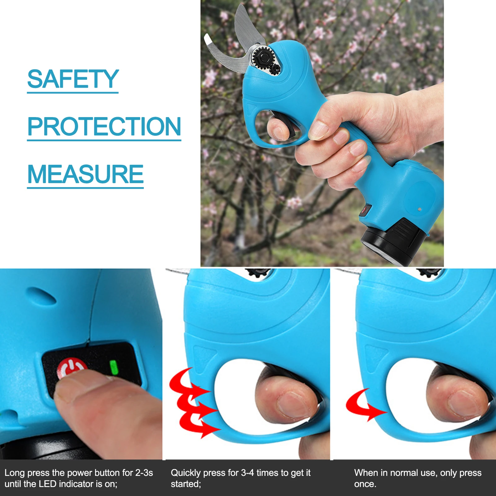 Safety Protection Measure — Our electric pruning scissors have a safety protection measure, you need to long press the power button for 2-3s until the LED indicator is on, and quickly press the trigger for 3-4 times before it can use normally, so as not to cause unnecessary injury.