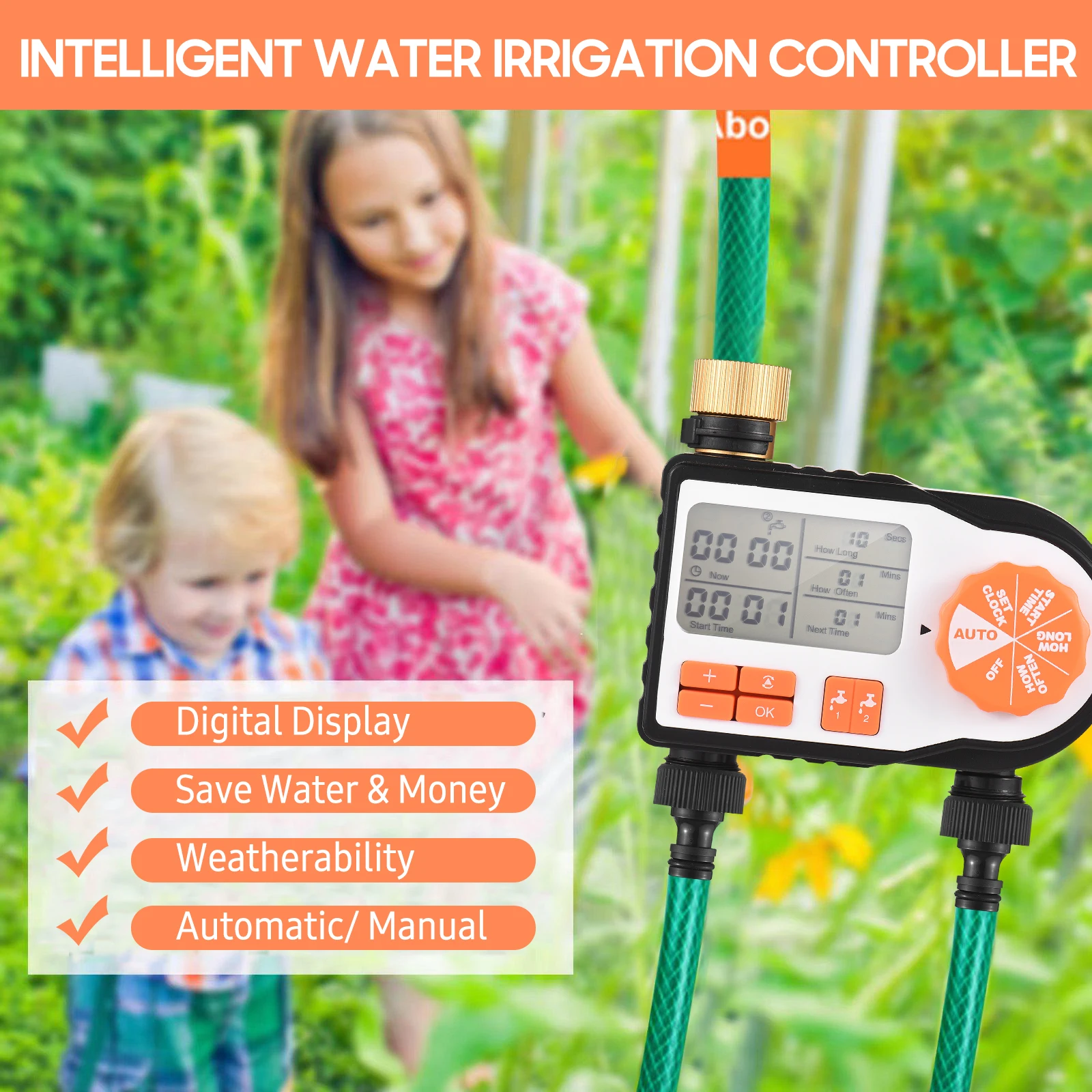Intelligent water irrigation controller makes irrigation easier, more convenient and more efficient. Battery operated design and digital display screen make it easy to use. It’s suitable for plant watering, agriculture irrigation, greenhouse humidification, dust removal, cooling the courtyard and more!