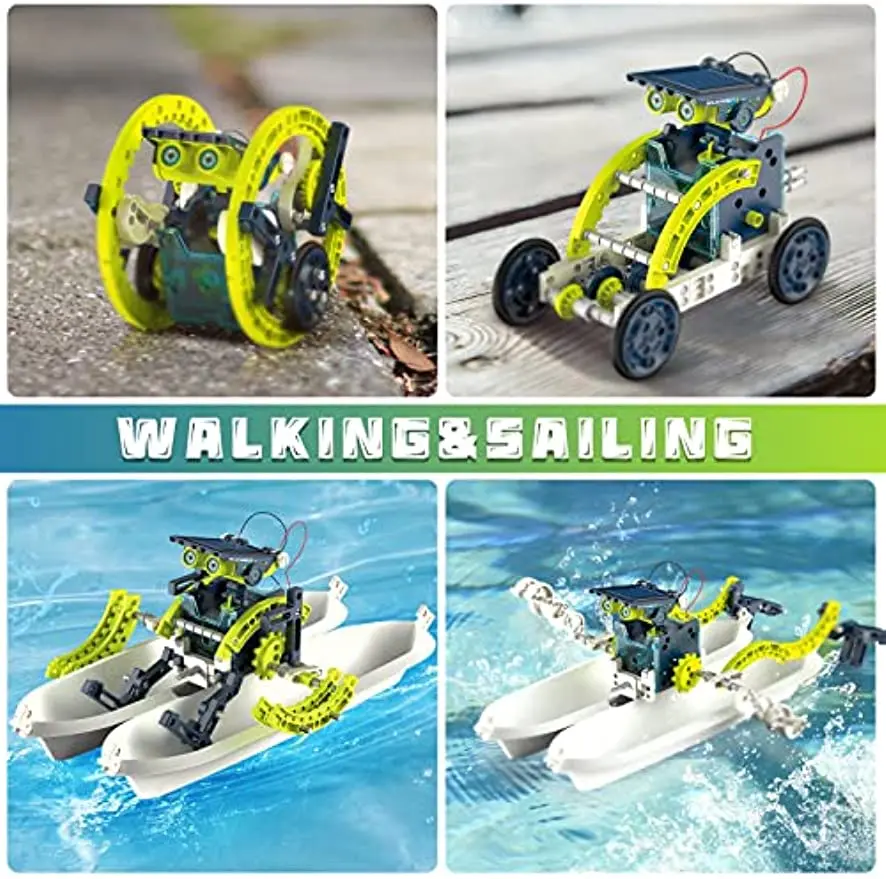 【12-in-1 Solar Robot Kit】Comes with 190 piece parts, the toys for kids 8-12 can build 12 different shapes of robots, and they can walk on land or sail on water. Kids can enjoy hours of gaming fun while stimulating their imagination and creativity